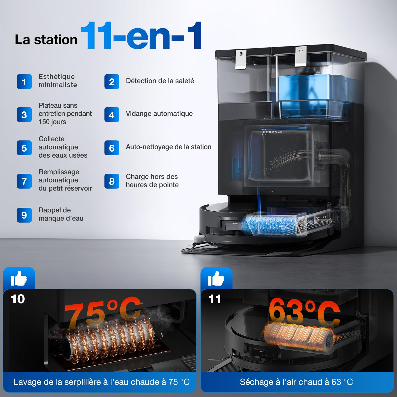 ECOVACS X8 Omni Robot Aspirateur Laveur avec Station Omni, Aspirateur Robot 18000Pa, Nettoyage Automatique instantané OZMO Roller, Lavage à l'eau Chaude 75 ℃, Vidage Automatique, Noir